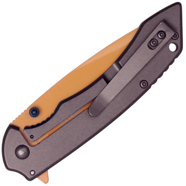 Assisted Open Folding Pocket Knife with Grey handle and Orange Blade.