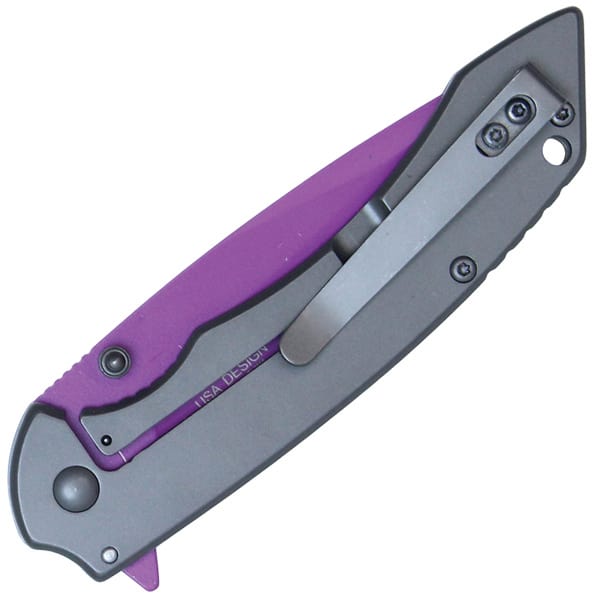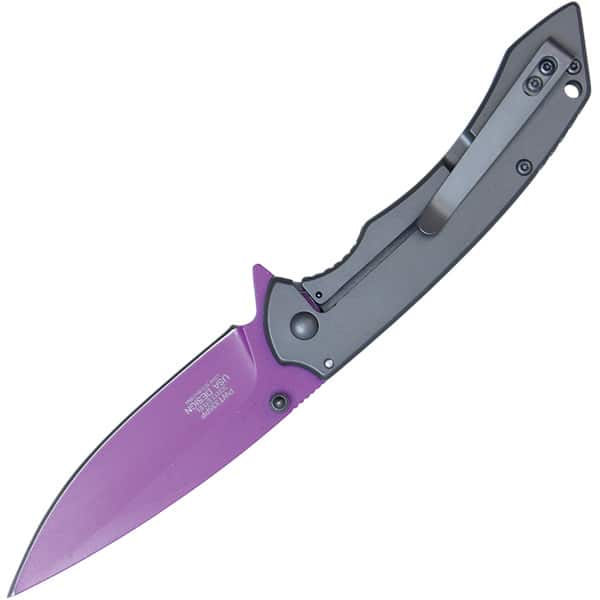 Assisted Open Folding Pocket Knife with Grey handle and Purple Blade.