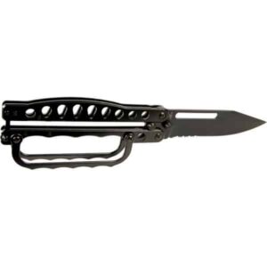 Stainless steel butterfly knife straight back blade is tapered and angled upward for a superior cut. The stainless steel handle is finished with a smooth, comfortable surface. The handle is well balanced with tactical cutouts and a light weight design for, solid flipping. The handle features a latch for to lock the knife when not in use. Plasma Color
