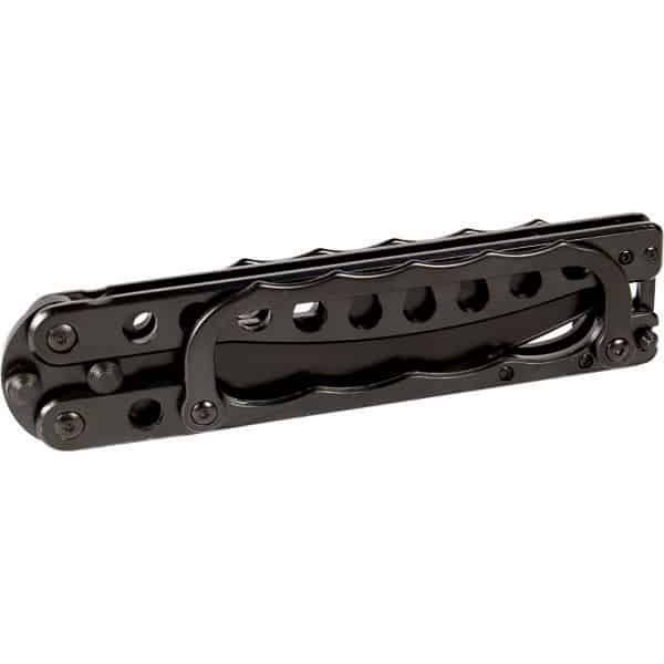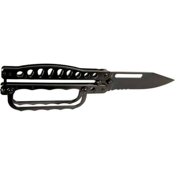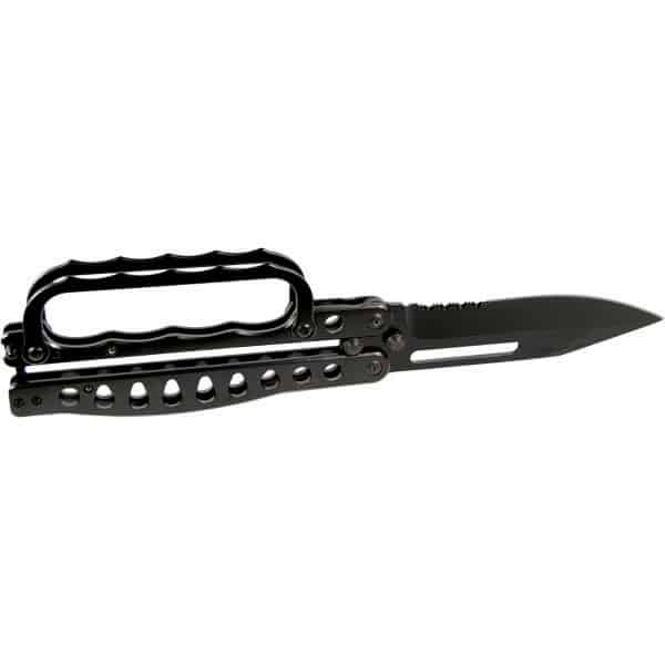 This is a heavy duty well built knuckle butterfly trench knife. It’s all metal and super sharp with a serrated blade. The butterfly knuckle knife has a metal knuckle guard screwed onto the handle for easy removal if you don’t want it attached. Black Color