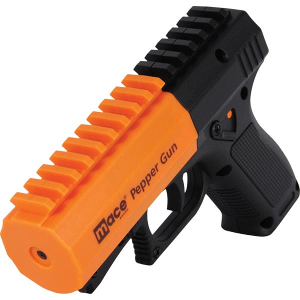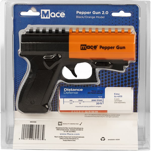 The Mace® Brand Pepper Gun 2.0 provides distance defense with convenient point-and-shoot accuracy. The advanced delivery system sprays a power stream of OC pepper up to 20 feet away and from any angle. Refill the Pepper Gun with easy-to-load cartridges. DUAL MODE LED light distracts your attacker and helps aim at your target in the dark. Engage the trigger once to activate the steady LED flashlight feature. Engage the trigger a second time for the pulsating LED strobe. Comes with a OC Pepper Cartridge and a Water Practice Cartridge. Integrated Picatinny rail allows you to attach accessories to your Pepper Gun.