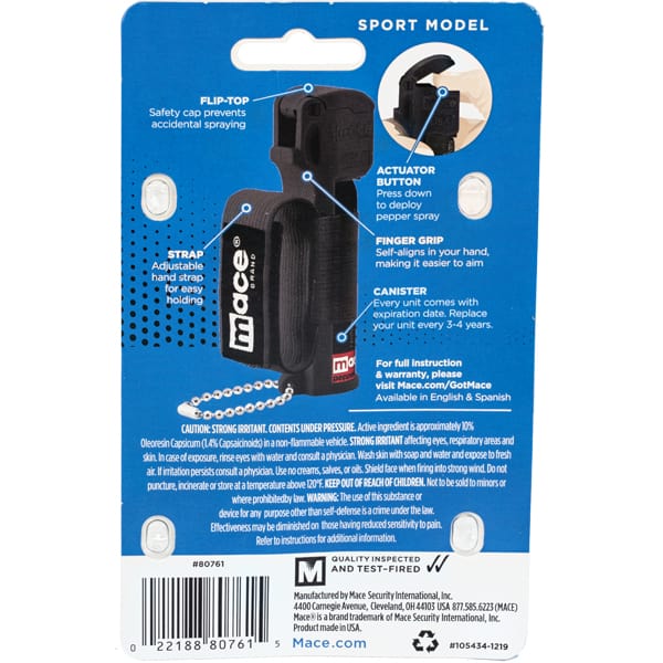 You can carry the Mace® Pepper Spray Jogger on your key-chain, fasten it in the hand with the Velcro-like strap. It’s ideal for sports and outdoor activities such as running or hiking. 18 gram unit range of 12 feet and contains 20 short burst