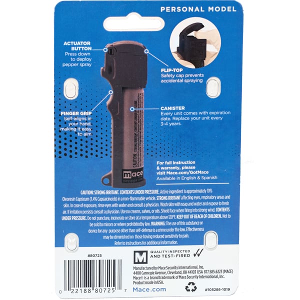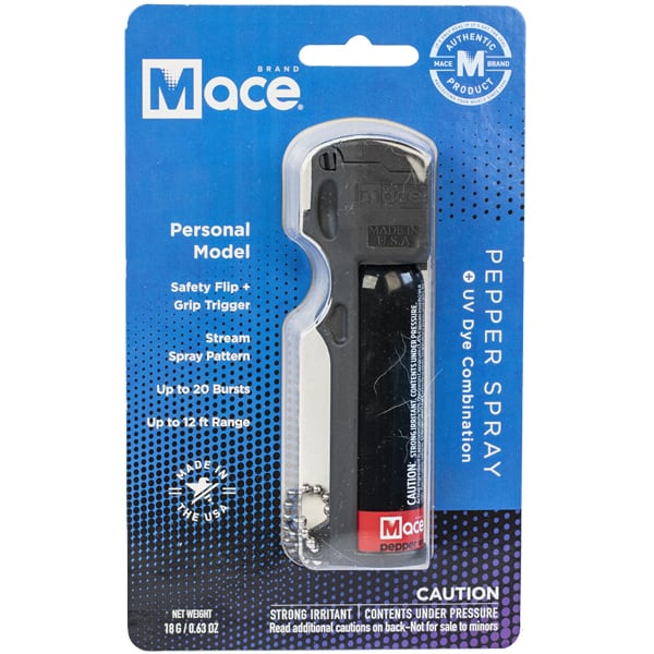 The Mace Personal Model pepper spray is a powerful formulation of OC pepper spray that will quickly shut the eyes, and induce coughing, choking and a burning sensation. This 18 gram unit contains an approximate 20 stream pattern bursts with a reach of 12 feet.