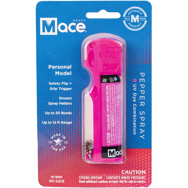The Mace Personal Model pepper spray is a powerful formulation of OC pepper spray that will quickly shut the eyes, and induce coughing, choking and a burning sensation. This 18 gram unit contains an approximate 20 stream pattern bursts with a reach of 12 feet.