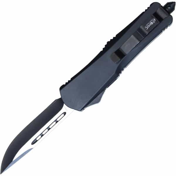 OTF(Out The Front) automatic heavy duty knife single edge blade. Black color made of premium quality steel. Lightning-fast automatic blade deployment, fast and easy to retract the blade.