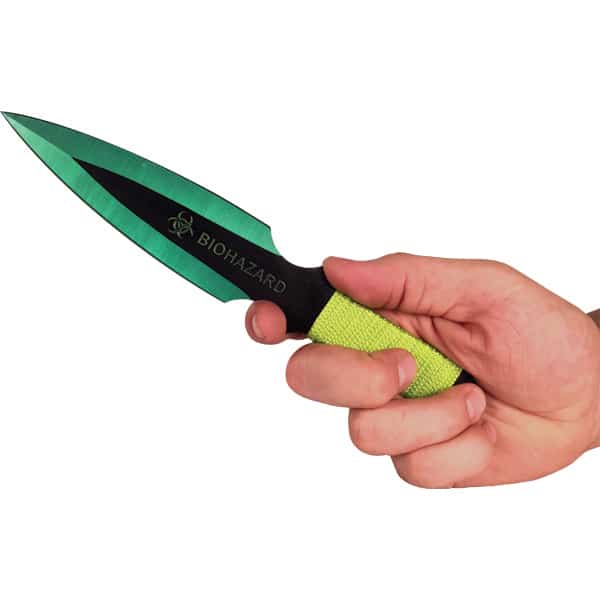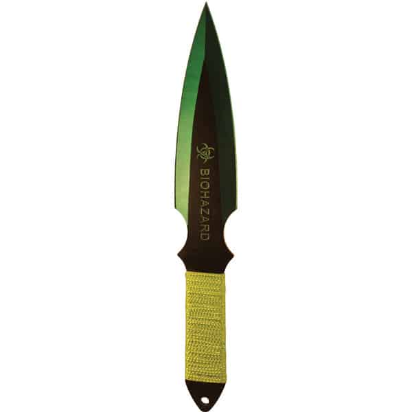 2 Piece Throwing Knife Green Color BioHazard. 9″ Length, 2 Piece Set, made from 440 stainless steel, great beginner to intermediate throwing knife. Includes sheath pouch for knives.