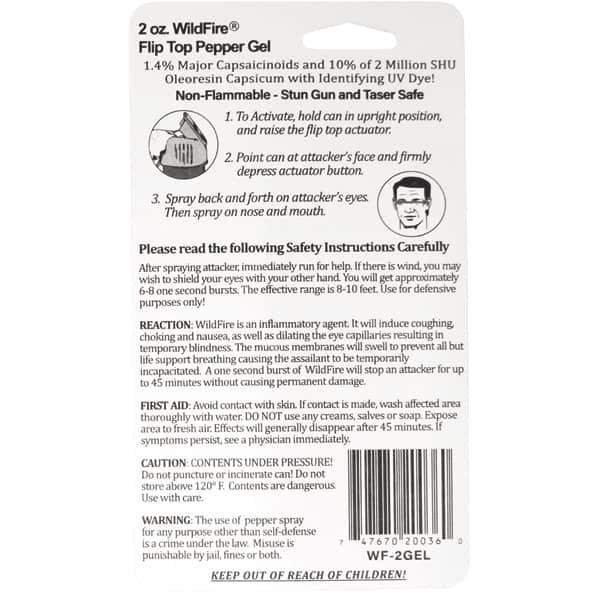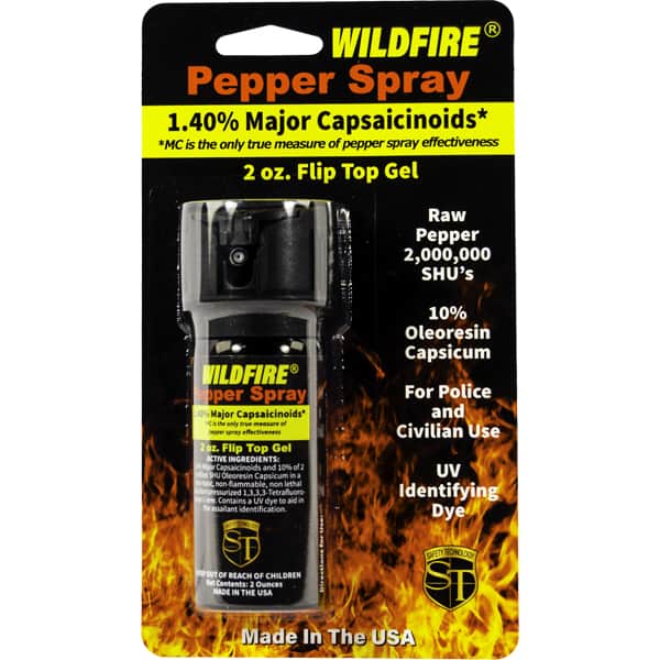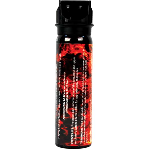 Wildfire 1.4% MC flip top actuator pepper gel stream. The WILDFIRE® PEPPER SPRAY is hot, hot, hot. The Major Capsaicinoids are the true heat measure, WildFire has the hottest on the market at 1.4% Major Capsaicinoids. In addition to causing an attacker pain, The WildFire 10% oleoresin capsicum formula swells the mucous membranes, which makes breathing difficult, and swells the veins in the eyes, causing the eyes to close.